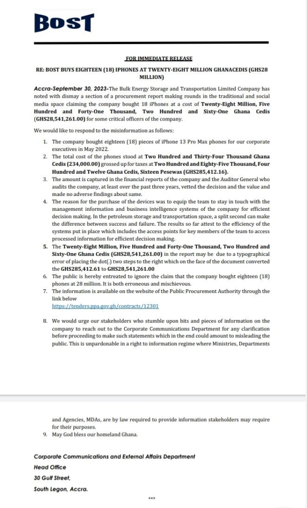 The Bulk Energy Storage and Transportation Limited Company (BOST) has refuted claims that it acquired iPhones worth ¢28.541 million for certain essential personnel within the organization.