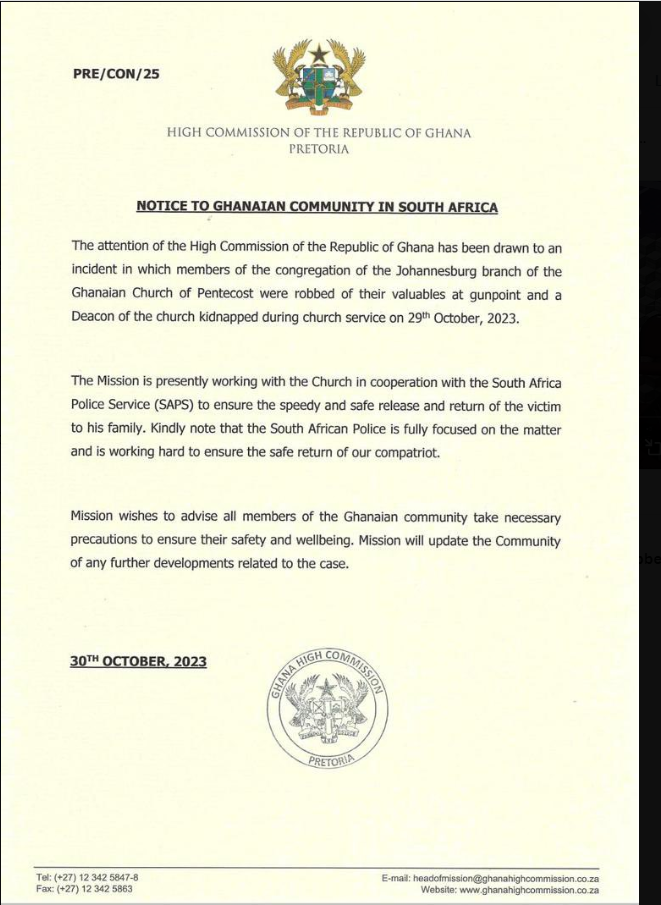 “The attention of the High Commission of the Republic of Ghana has been drawn to an incident in which members of the congregation of the Johannesburg branch of the Ghanaian Church of Pentecost were robbed of their valuables at gunpoint and a deacon of the church kidnapped during church service on October 29, 2023,” the Mission said.