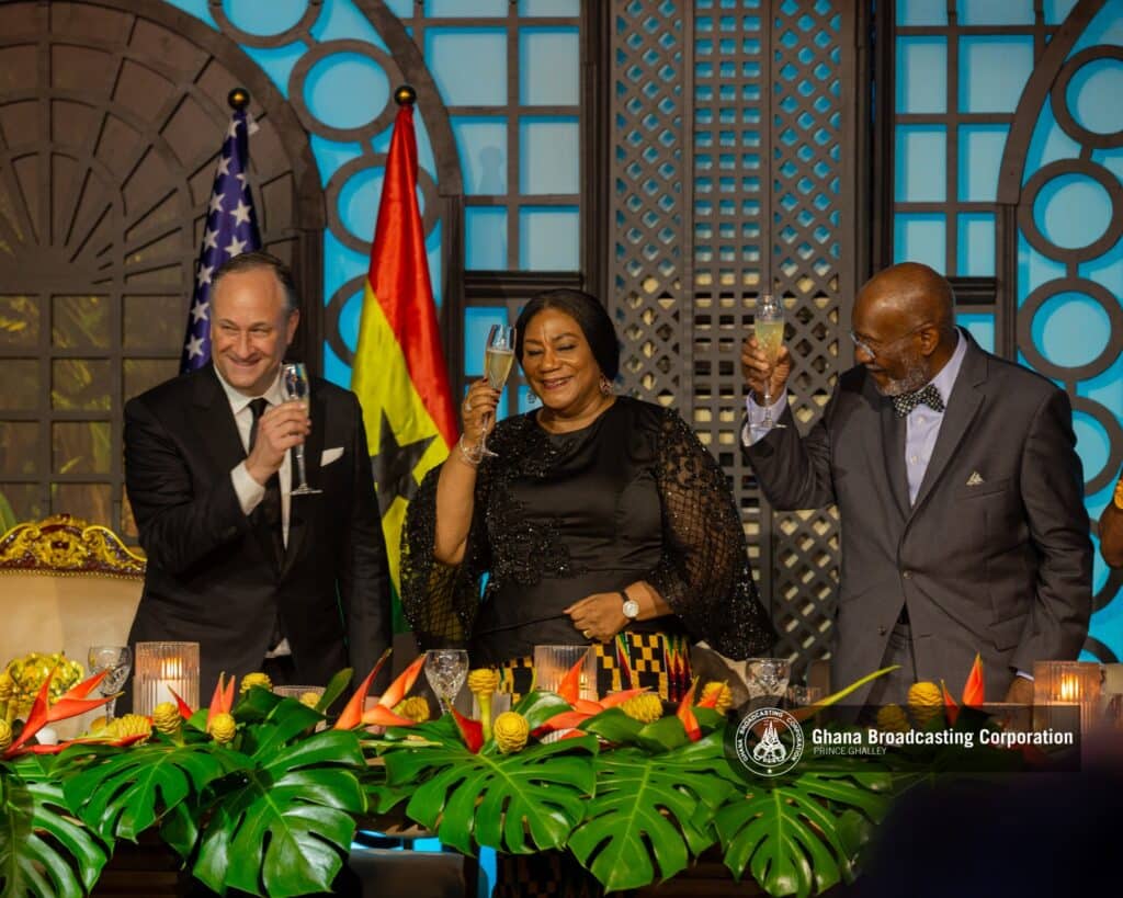 Kamala Harris descended from the plane after touching down at Ghana’s Kotoka International Airport. Photo Credit: David AndohA young Ghanaian presents a bouquet of flowers to the US Vice President. Photo Credit: Dr Mahamudu Bawumia via FacebookVice President of Ghana, Dr Mahamudu Bawumia, welcomes US Vice President, Kamala Harris. Photo Credit: Dr Mahamudu Bawumia via FacebookKamala Harris exchanges pleasantries with Ghana’s Foreign Affairs Minister. Photo Credit: David AndohCulture on full display as Ghana welcome US Vice President, Kamala Harris. Photo Credit: Dr Mahamudu Bawumia via FacebookKamala Harris walks to the podium to deliver the first speech of her three-nation African tour. Photo Credit: Ministry of Information via FacebookSome Ghanaian students wave flags to welcome US Vice President. Photo credit: Ministry of Information via FacebookUS Vice President Kamala Harris touched by the warm welcome. Photo Credit: Ministry of Information via FacebookKamala Harris delivers the first speech of her one week diplomatic tour of Africa. Photo Credit: Ministry of Information via FacebookAmong other things, Madam Harris hoped her engagements during the tour would increase investments in Africa. Photo credit: Ministry of Information via FacebookKamala Harris radiantly smiles at the students who gathered at the Airport to welcome her. Photo Credit: Ministry of Information via FacebookUS Vice President walks towards students gathered on the grounds. Photo Credit: Ministry of Information via FacebookKamala Harris interacts with students who cheered on her arrival. Photo Credit: Dr Mahamudu Bawumia via FacebookKamala Harris escorted to the Jubilee Lounge after her address. Photo Credit: Dr Mahamudu Bawumia via FacebookGhana’s Vice President, Mahamudu Bawumia interacts with US Vice President Kamala Harris at the Jubilee Lounge. Photo Credit: Dr Mahamudu Bawumia via Facebook
