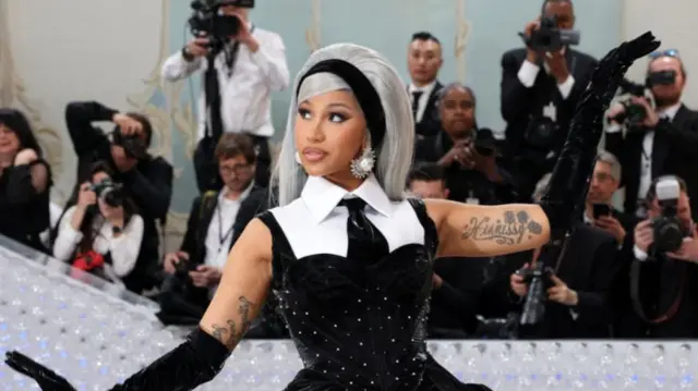 Cardi B poses on red carpet in black velvet gown, sleeveless white shirt with velvet black tie and velvet gloves