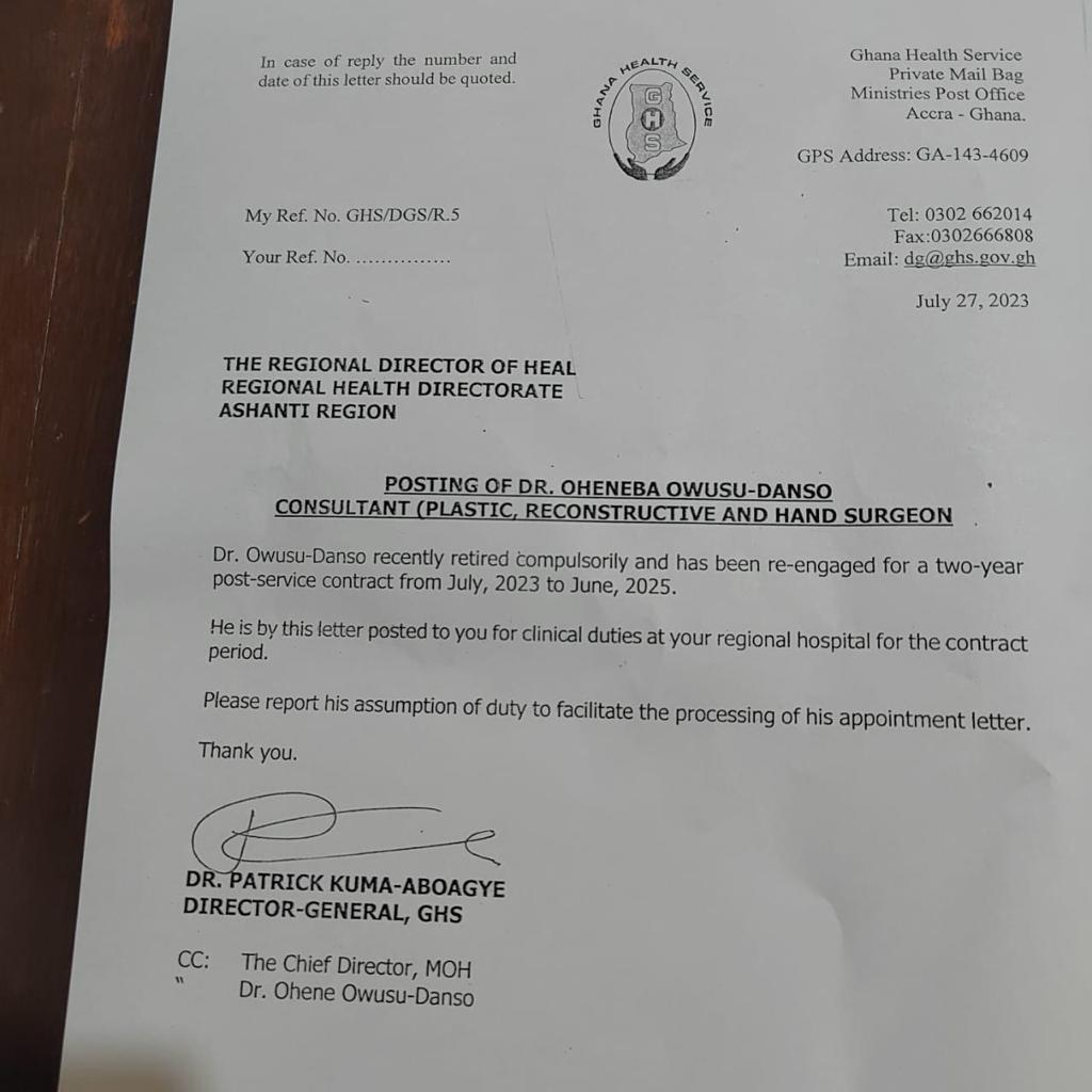 A communication from the Director General of the Ghana Health Service, Dr. Patrick Kumah Aboagye, revealed the decision to assign Dr. Oheneba Owusu Danso to a two-year contract as a Consultant specializing in Plastic, Reconstructive, and Hand Surgery at Kumasi South Hospital.