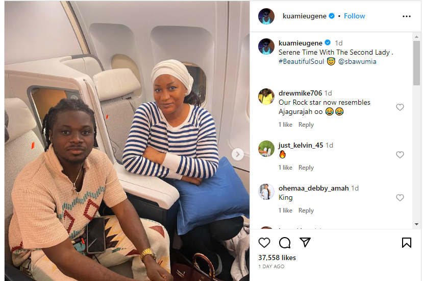 A recent photo of Second Lady, Samira Bawumia, taken alongside Ghanaian musician Kuami Eugene during a plane journey, has left a section of social media users astonished. The photo showcased Mrs. Bawumia without make-up, revealing her radiant skin and natural beauty.