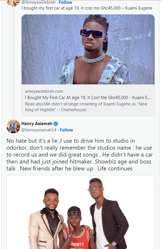 In the wake of the reactions to this revelation byKuami Eugene, a gentleman on Twitter who goes by the name Henry Asiamah has come out to state that the “Cryptocurrency” hitmaker is lying.