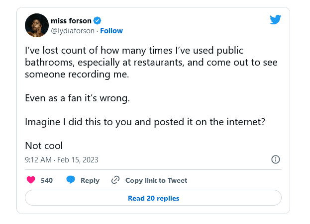 According to her, she has lost count of the times fans have recorded her using public washrooms in places such as restaurants.