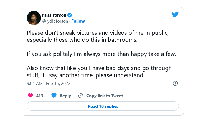 “And shoving cameras in peoples faces and not giving them even a moment of privacy. Like?!!” Forson’s tweet of March 17 read.