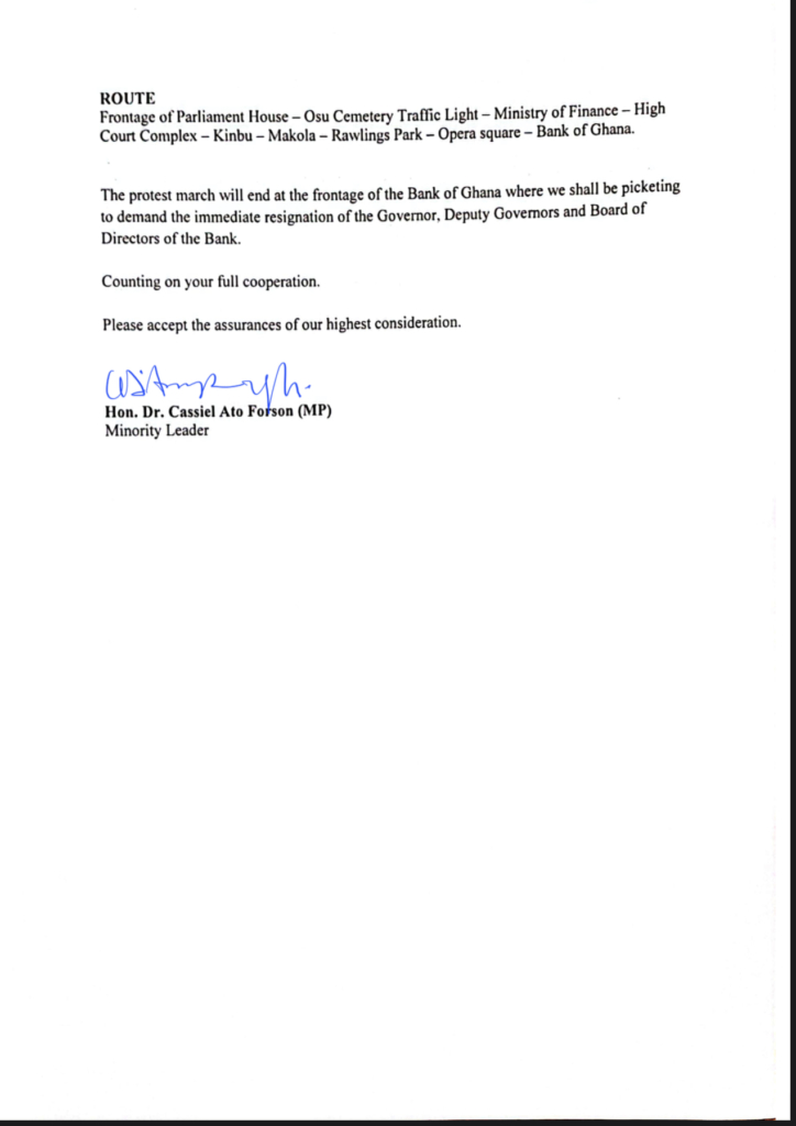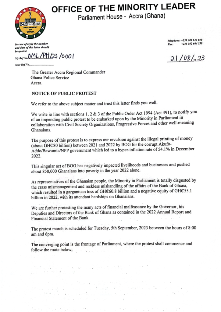 “We write in line with sections ,1 2&3 of the Public Order Act 1994 (Act 491), to notify you of an impending public protest to be embarked upon by the Minority in Parliament in collaboration with Civil Society Organizations, Progressive Forces and other well-meaning Ghanaians.”