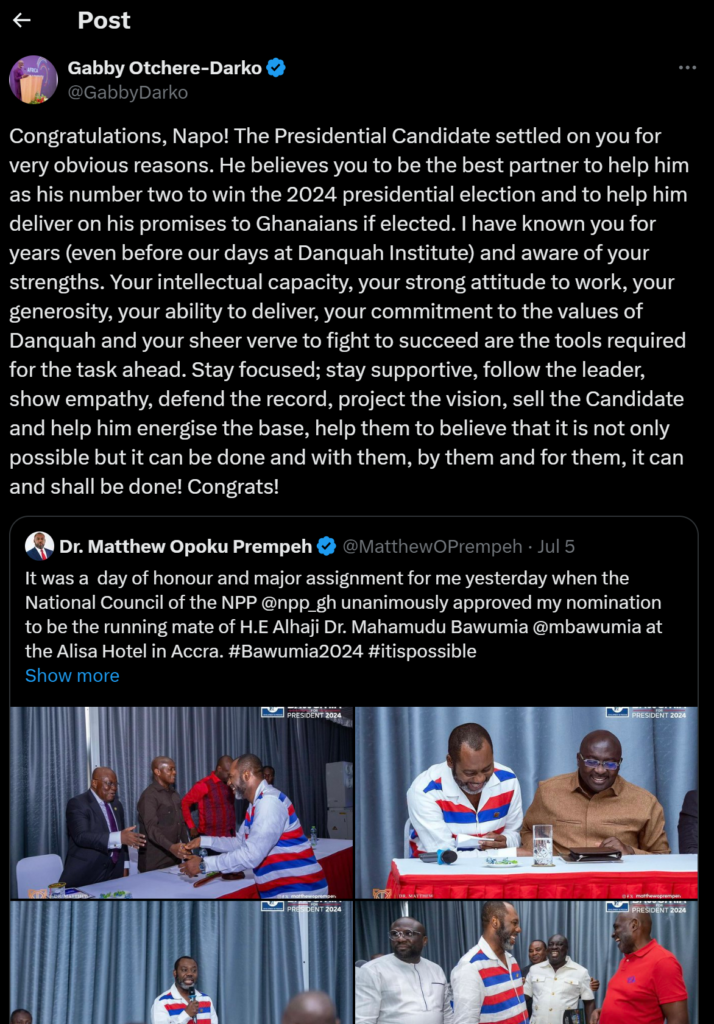 “So, if an NPP running mate says that the president—let’s remember that Nana Addo Dankwa Akufo-Addo is the president who has given NAPO the leeway to do everything—he practically made him; gave him an opportunity to serve in his government in two very important positions as Minister of Education, where he implemented his flagship program, and then moved him to the Ministry of Energy. And for me, and a lot of Ghanaians, NAPO has done exceptionally well.