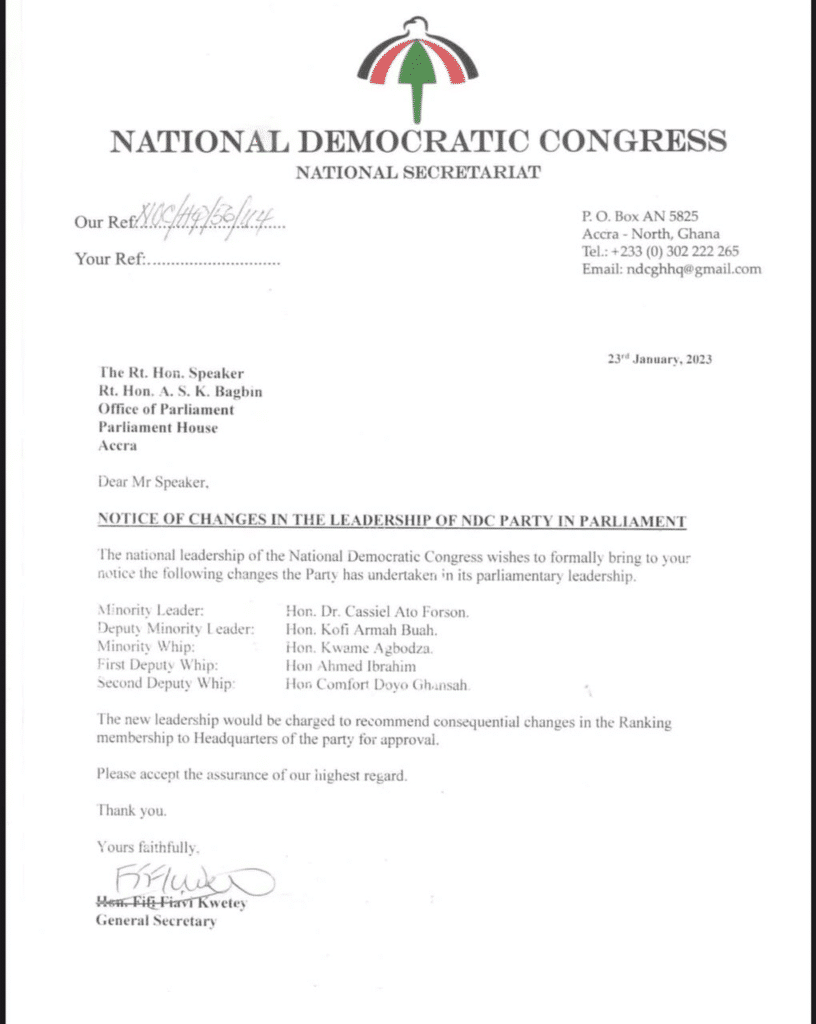 The change in leadership was announced by the National Democratic Congress (NDC) in a letter to the Speaker of Parliament