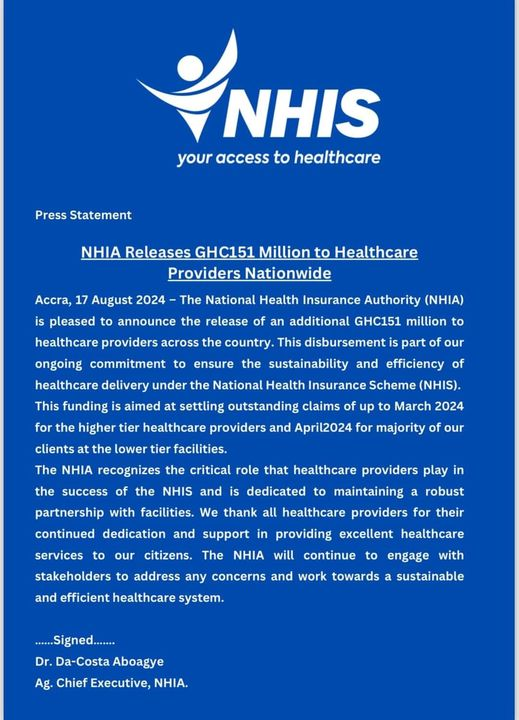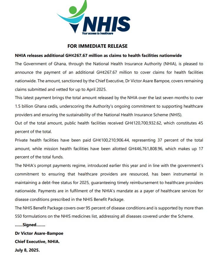 The NHIA in early July 205 disbursed an amount of GH¢267.67 million as claims to health facilities across the country. The disbursement became possible following approval by Chief Executive Dr. Victor Asare-Bampoe. The total payments made by the NHIA in the past seven months stand at over GH¢1.5 billion.