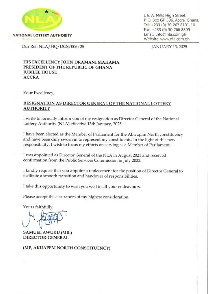 Samuel Awuku has stepped down as the Director-General of the National Lottery Authority (NLA), with his resignation taking effect from January 13, 2025.