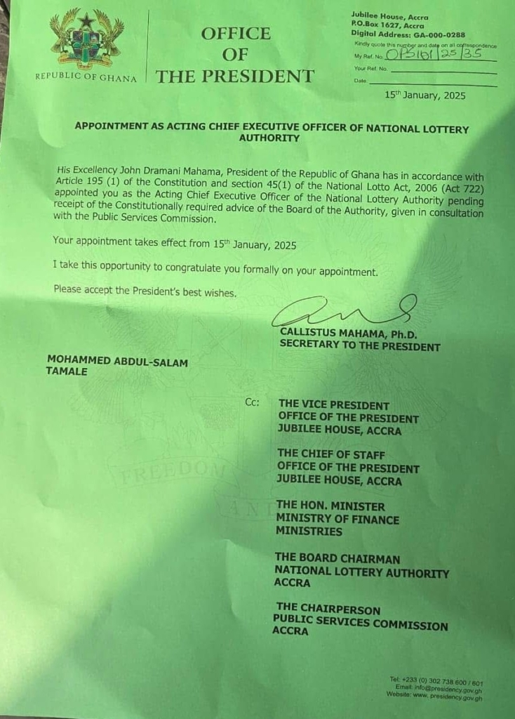 The appointment of Mohammed Abdul-Salam, effective Wednesday, January 15, 2025, was announced in a statement issued by the Secretary to the President. It was made in accordance with Article 195(1) of the Constitution and Section 45(1) of the National Lotto Act, 2006 (Act 722).