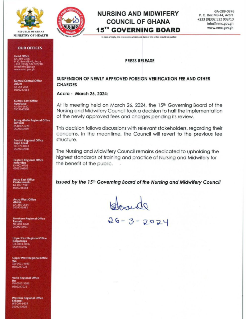 “At its meeting held on March 26, 2024, the 15th Governing Board of the Nursing and Midwifery Council took a decision to halt the implementation of the newly approved fees and charges pending its review.