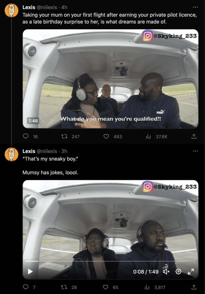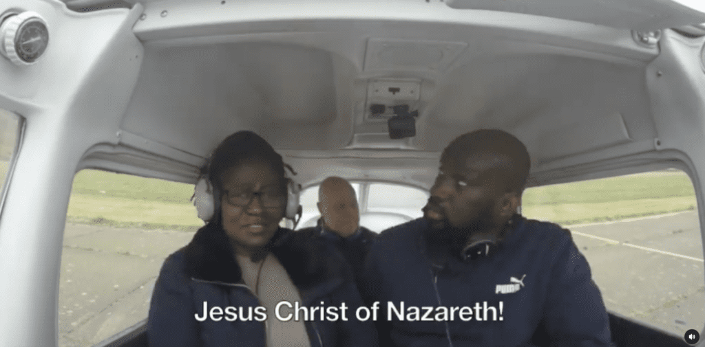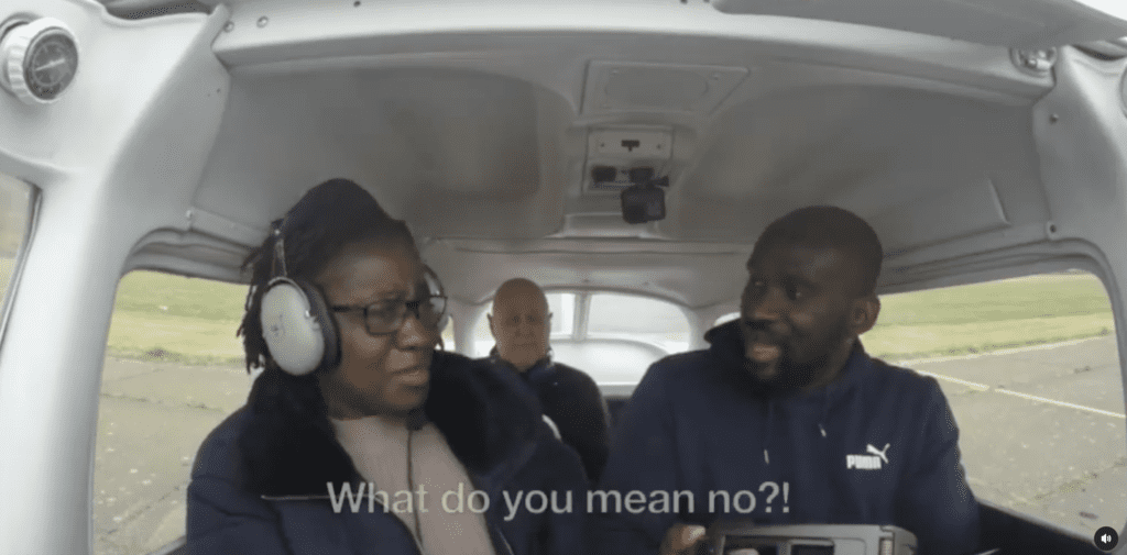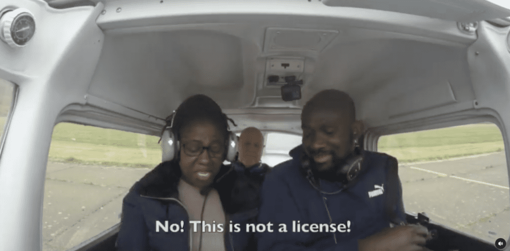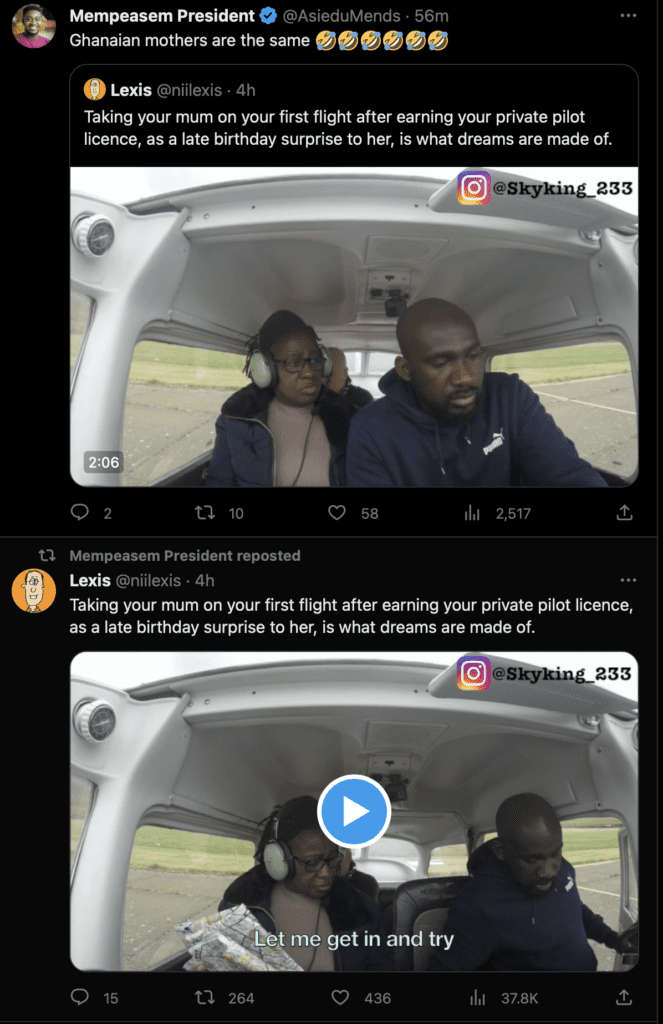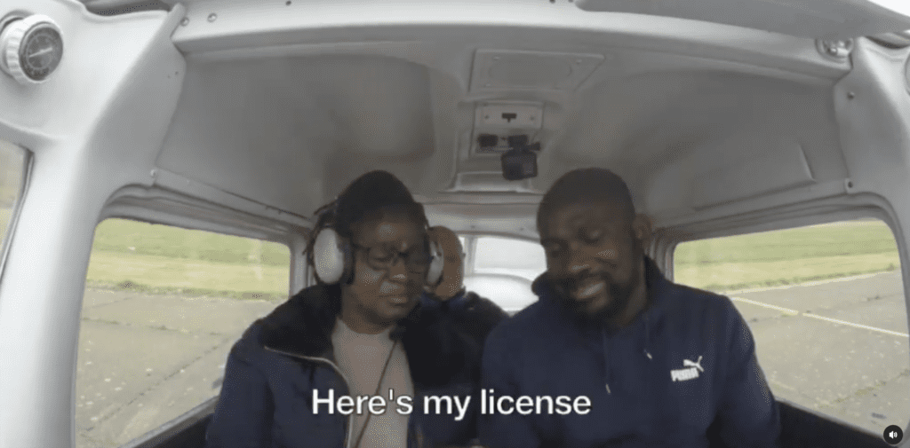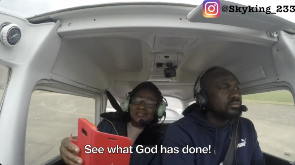 In the video, Kwesi’s mum is seen sitting in the passenger seat of a small plane, unaware that her son is the pilot. When he announces to her that he is going to fly the plane, she starts to panic and scream, saying “you won’t fly this plane. Where do you think you are going, Kwesi stop! stop!”