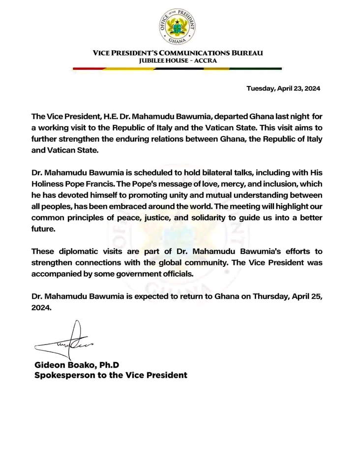 A statement issued by spokesperson Dr. Gideon Boako indicated that the Vice President will engage in bilateral discussions with His Holiness Pope Francis.