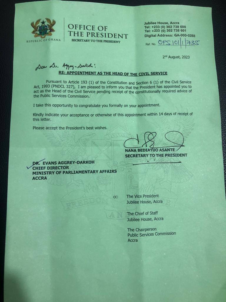 A communication bearing the signature of Nana Bediatuo Asante, the Secretary to the President, has stipulated that Dr. Aggrey-Darkoh has a span of 14 days to formally accept the appointment.