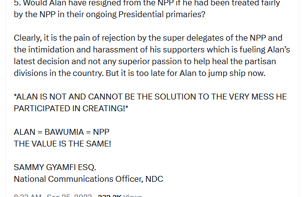 “I cannot understand why the NDC will collaborate with Kissi Agyebeng’s preferred rented media house and his chief executioner, Sampson Lardy Anyenini, to make allegations against me without publishing the alleged petition on which the allegations are based to provide me the opportunity to confirm or deny my signature and rebut or admit the accusations,” he said.