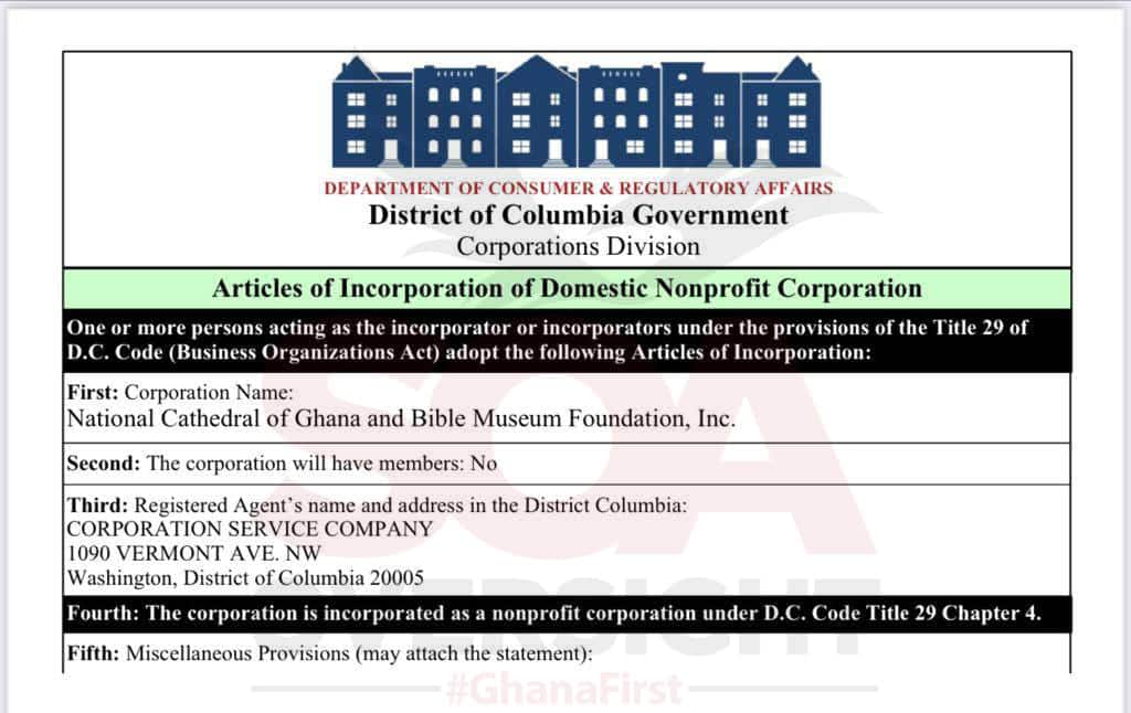 “Articles of Incorporation we have secured from the District of Columbia Government’s Department of Consumer and Regulatory Affairs (corporation’s division) confirm that a nonprofit corporation has been registered known as the “National Cathedral of Ghana and Bible Museum Foundation, Inc.”