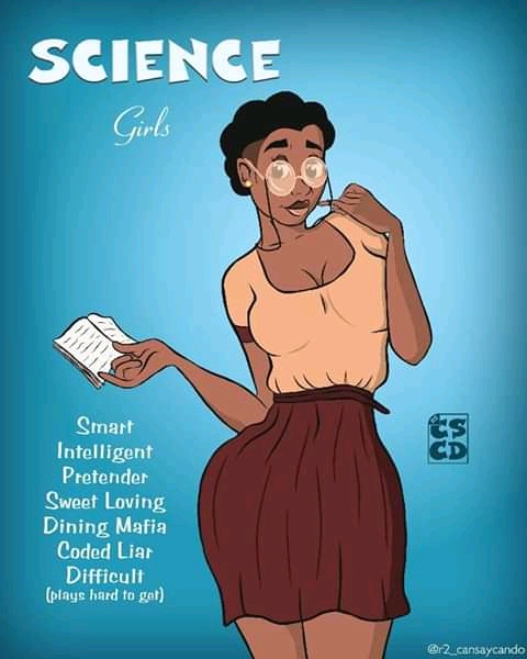 General Science girls are termed as smart and intelligent.They are pretenders.They are sweet loving girls.Boys normally like to sit with boys because of science girls .This make them termed as “dining mafia”.They are coded liar and very difficult.