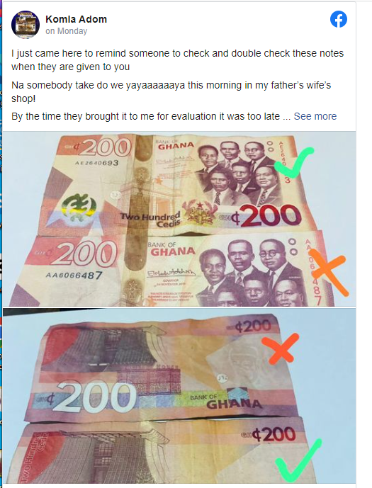Social media user Komla Adom posted images of counterfeit GH200 Cedi notes and cautioned the public to exercise caution.