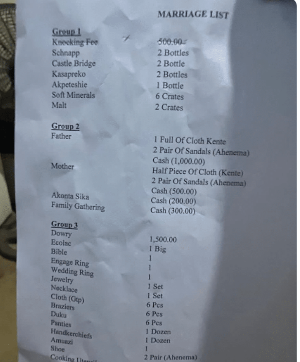 A young man recently took to social media to reveal the elaborate list provided by his girlfriend‘s family after expressing his intention to marry their daughter.