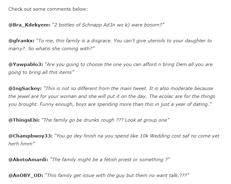 The disclosure on social media has sparked conversations about the tradition of marriage requirements, with many expressing their opinions on the perceived extravagance of the demands.