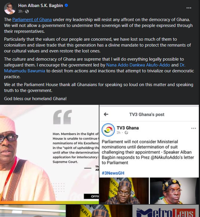 Citing Articles 117 and 118 of the 1992 Constitution, Bagbin directed that the meeting be held within Parliament’s premises. The meeting was scheduled for Monday, April 7, at 10:00 AM, inside the Sir Emmanuel Charles Quist Conference Room at the Office of the Speaker.