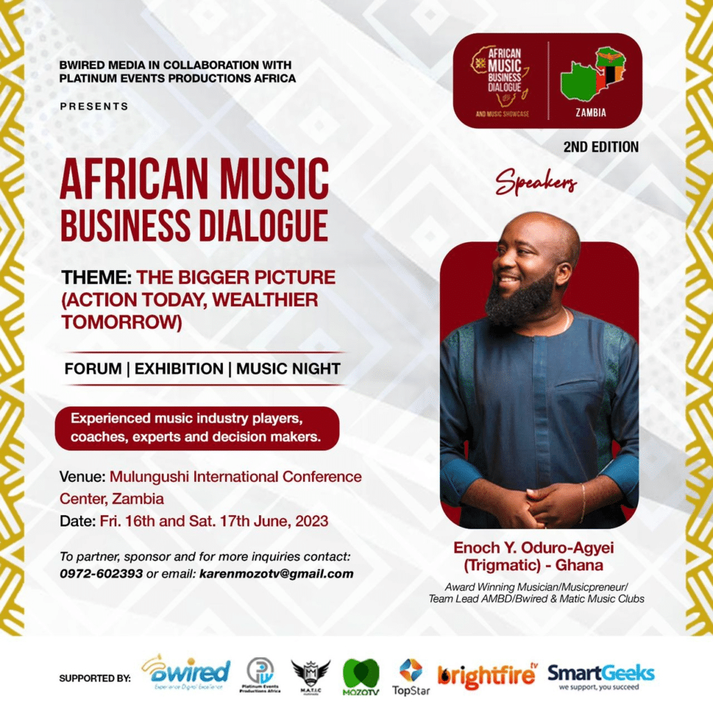 The African Music Business Dialogue is organised in partnership with Platinum Events Zambia and Mozo TV and created by Trigmatic, an award-winning Ghanaian musician.