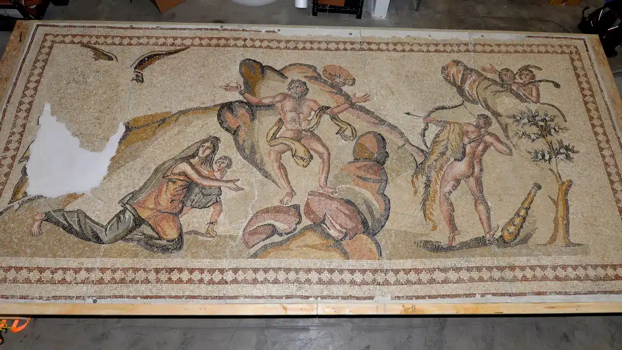 The mosaic, thought to date back to the Byzantine era of the Roman empire, shows a mythological scene: Hercules rescuing Prometheus, who was chained to a rock by other gods for stealing fire.