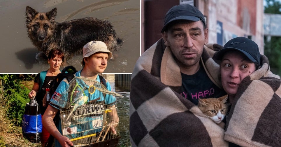 As more than 17,000 residents fled their houses on the banks of the Dnipro River, wading through knee-deep water, many had to abandon their pets and livestock to save themselves.